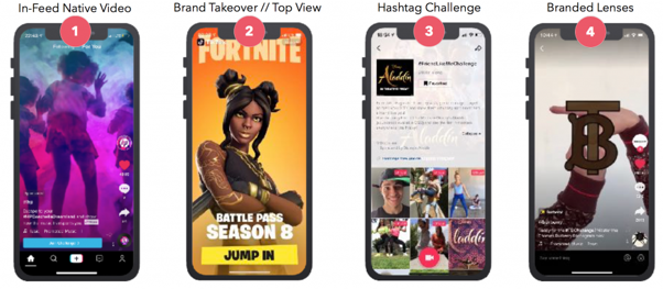 TikTok provides four different ad formats to choose from: brand takeovers, native video ads, hashtag challenges, and branded lenses.